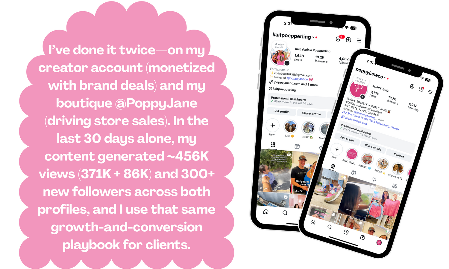 From boutiques to service pros and restaurants, I turn your socials into a simple, repeatable growth system. We’ll build a clear content strategy, weekly calendar, and conversion paths that move followers to action. Choose a one-time strategy session or ongoing weekly/monthly coaching for steady momentum.